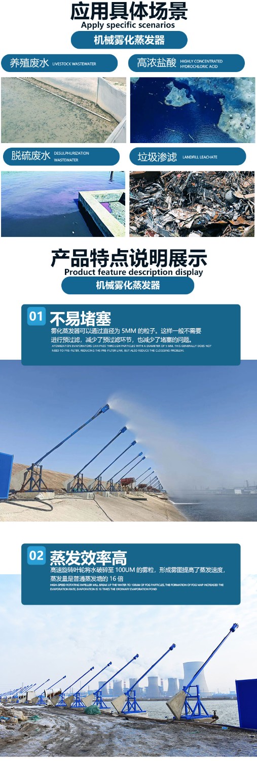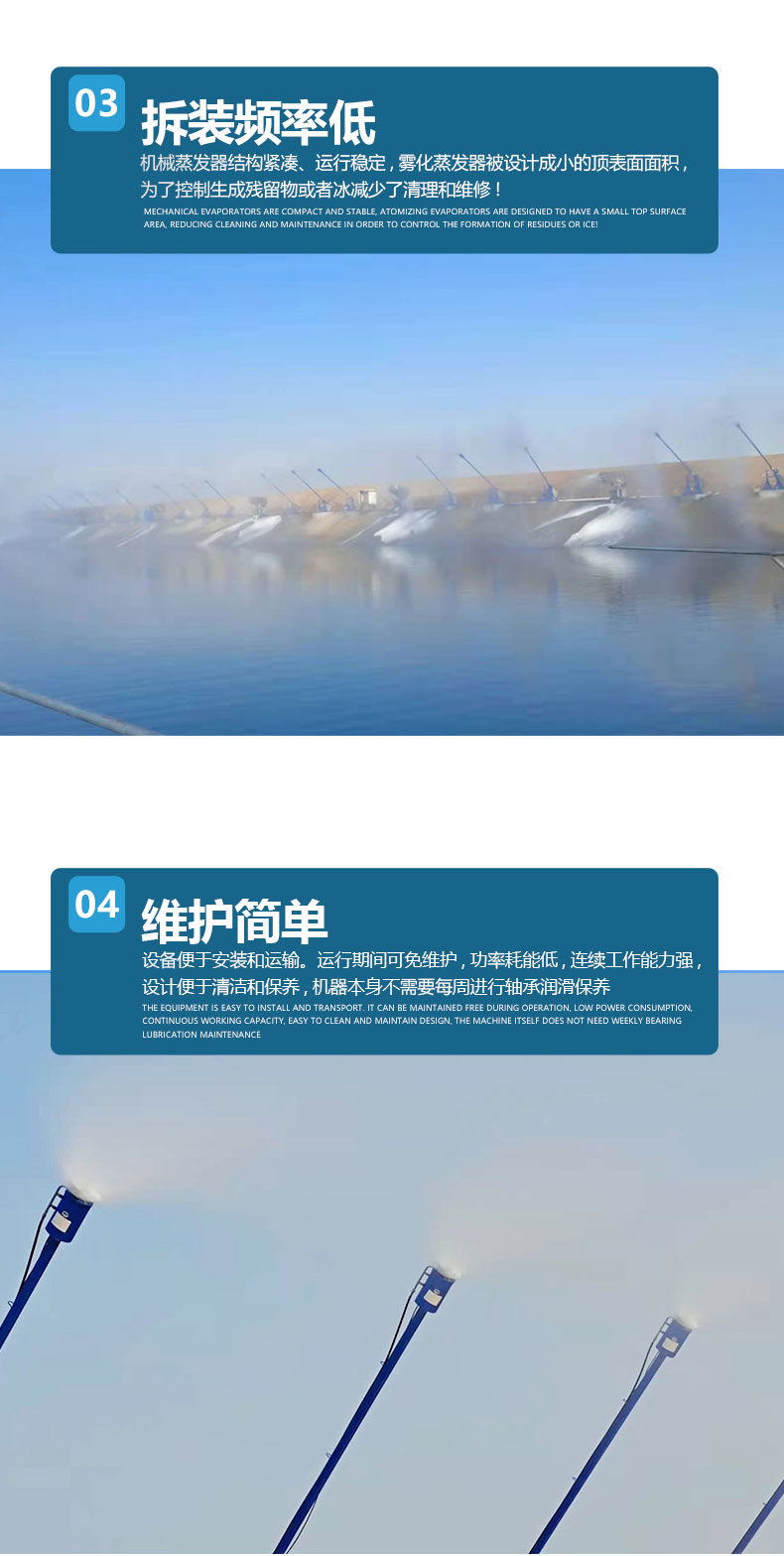 机械蒸发可以大大增加蒸发的速度,相同的水塘面积机械蒸发的 速度是普通蒸发塘的 16 倍以上。机械蒸发器结构紧凑、运行稳 定,而且可以便于安装和运输。机械蒸发是现有蒸发塘条件下一种低 成本的蒸发方式。